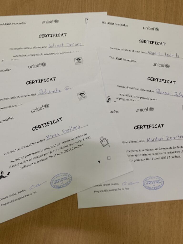 În scopul dezvoltării profesionale, creșterii și diversificării competențelor profesionale precum și în vederea eficientizării activității didactice prin joc, cadrele didactice din creșa-grădiniță nr.16: Snegur Silvia, Botezat Tatiana, Negara Ludmila, Potrîmba Tamara, Mîrza Svetlana, Mardari Dumitrița și Popovici Iulia au participat la formarea profesională continuă în perioada 10-11 iunie 2023 cu subiectul JOCUL CA MODALITATE NATURALĂ DE DEZVOLTARE MULTILATERALĂ ȘI DE SUSȚINERE A BUNĂSTĂRII COPILULUI, derulat în incinta Instituției Publice Școala „ Primară Pas cu Pas” nr.152, derulat în parteneriat cu UNICEF și Fondația LEGO.